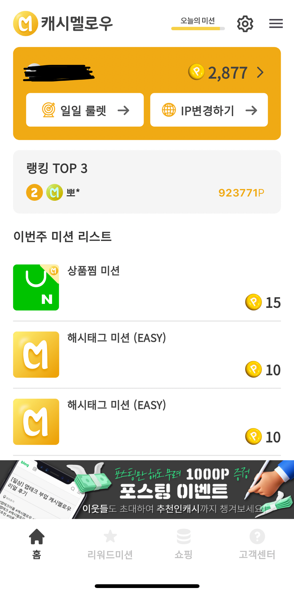 회원가입 후에는 어플 내에서 다양한 미션을 수행할 수 있습니다. 각 미션의 적립 포인트는 10 캐시부터 1000 캐시까지 다양하며 해시태그 미션, 쇼핑통합미션, 상품찜 미션, 포스팅 이벤트 등이 있습니다. 생긴 지 얼마 되지 않은 어플이라 계속해서 미션들이 수정, 업데이트를 거치고 있어 앞으로 더 쉽고 좋은 미션들이 많이 생길 것으로 보입니다.