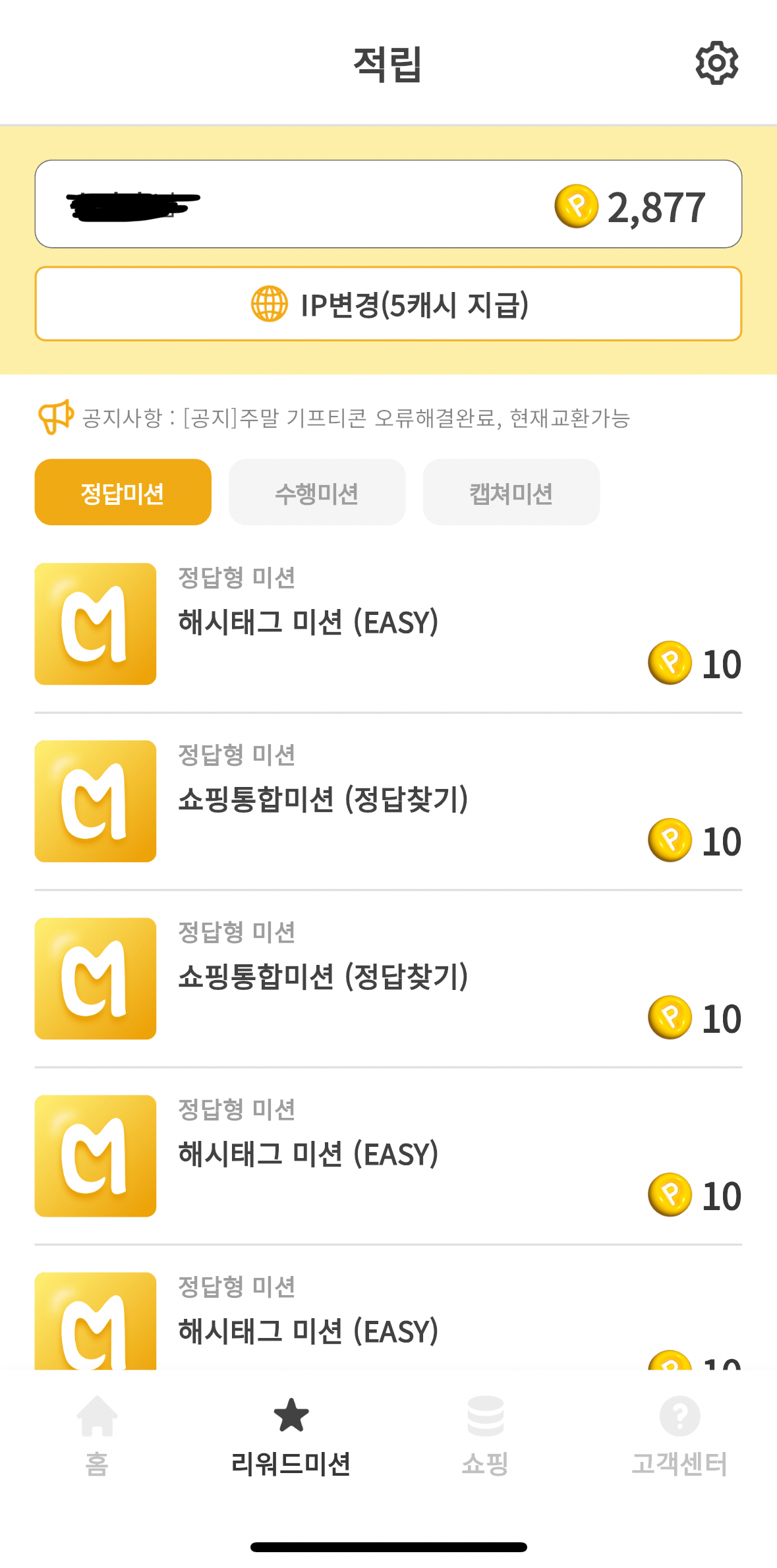 회원가입 후에는 어플 내에서 다양한 미션을 수행할 수 있습니다. 각 미션의 적립 포인트는 10 캐시부터 1000 캐시까지 다양하며 해시태그 미션, 쇼핑통합미션, 상품찜 미션, 포스팅 이벤트 등이 있습니다. 생긴 지 얼마 되지 않은 어플이라 계속해서 미션들이 수정, 업데이트를 거치고 있어 앞으로 더 쉽고 좋은 미션들이 많이 생길 것으로 보입니다.